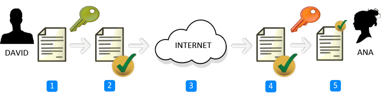 - Criptografíca de clave asimétrica: es el método criptográfico que usa un par de claves para el envío de mensajes. Las dos claves pertenecen a la misma persona que ha enviado el mensaje. Una clave es pública y se puede entregar a cualquier persona, la otra clave es privada y el propietario debe guardarla de modo que nadie tenga acceso a ella. Además, los métodos criptográficos garantizan que esa pareja de claves sólo se puede generar una vez, de modo que se puede asumir que no es posible que dos personas hayan obtenido casualmente la misma pareja de claves.Si el remitente usa la clave pública del destinatario para cifrar el mensaje, una vez cifrado, sólo la clave privada del destinatario podrá descifrar este mensaje, ya que es el único que la conoce. Por tanto se logra la confidencialidad del envío del mensaje, nadie salvo el destinatario puede descifrarlo.
